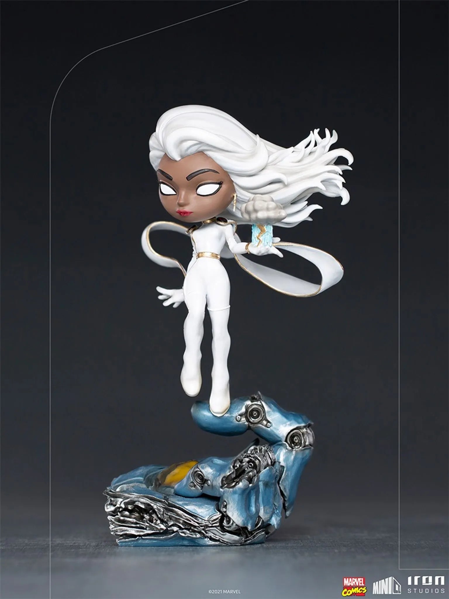 Floating on one of the fingers of what`s left of a Sentinel`s hand, the "Storm - X-Men - MiniCo - Iron Studios" statue presents Ororo Munroe along with the winds that she can control. With a small sample in the palm of her left hand, she shows that the weather can change for whoever faces her. Known as Storm, she is descended from an ancient lineage of African priestesses but grew up on the streets of Cairo as an orphan. In adulthood, she was recruited by Professor X and became one of the most important members of the X-Men. Ororo is an Omega-level mutant, and one of the main sources of her power is the Earth`s electromagnetic field, which allows her to control and manipulate water, wind, and electromagnetic fields.